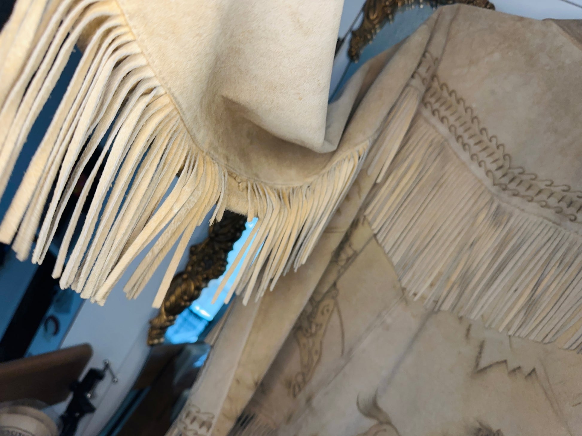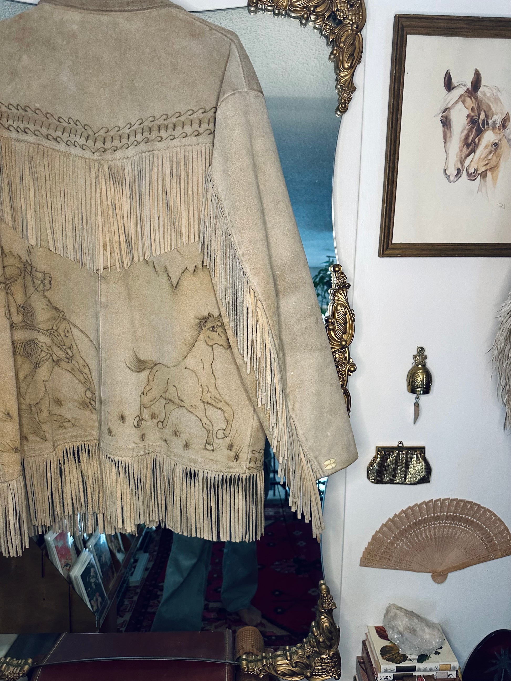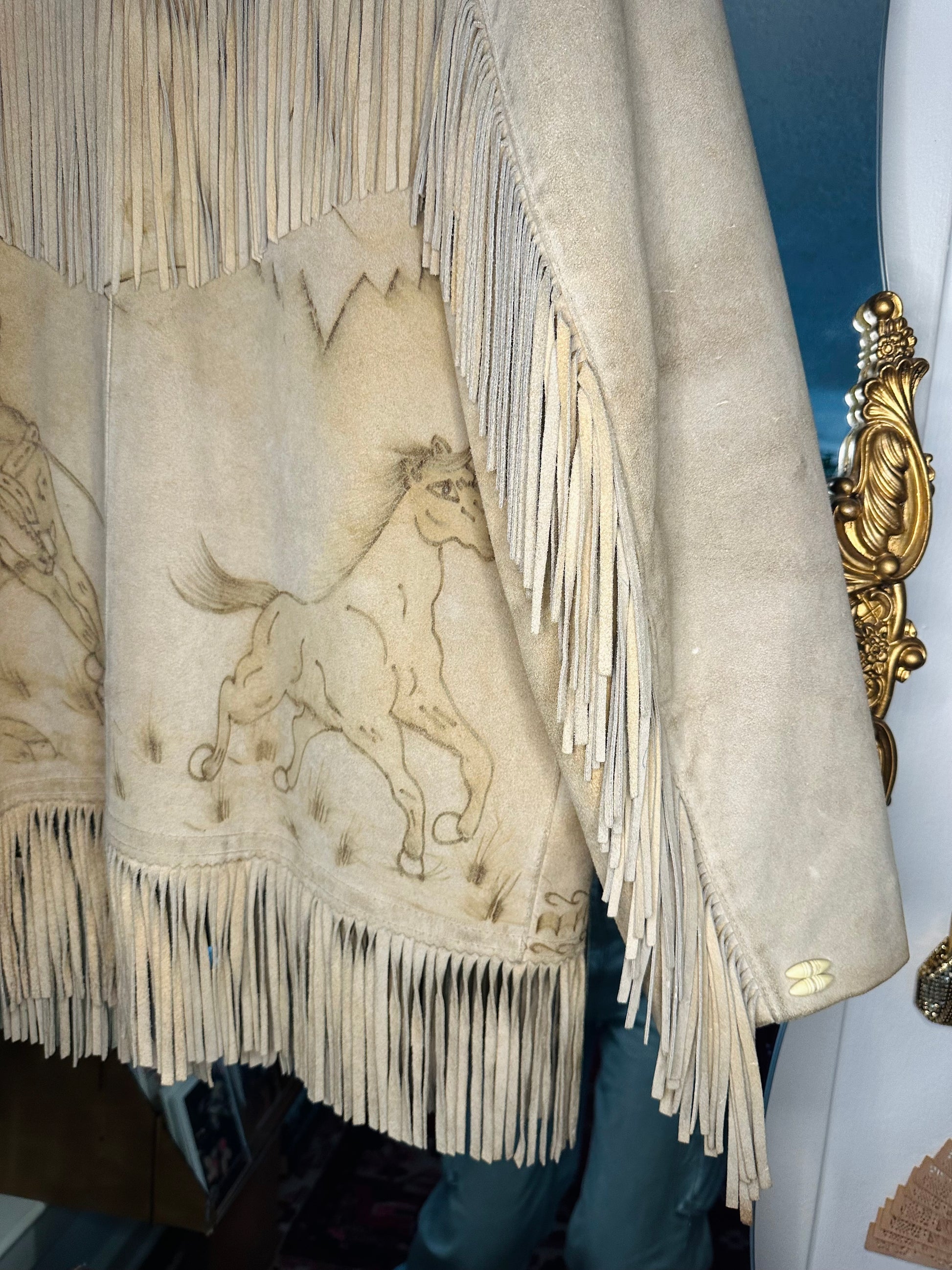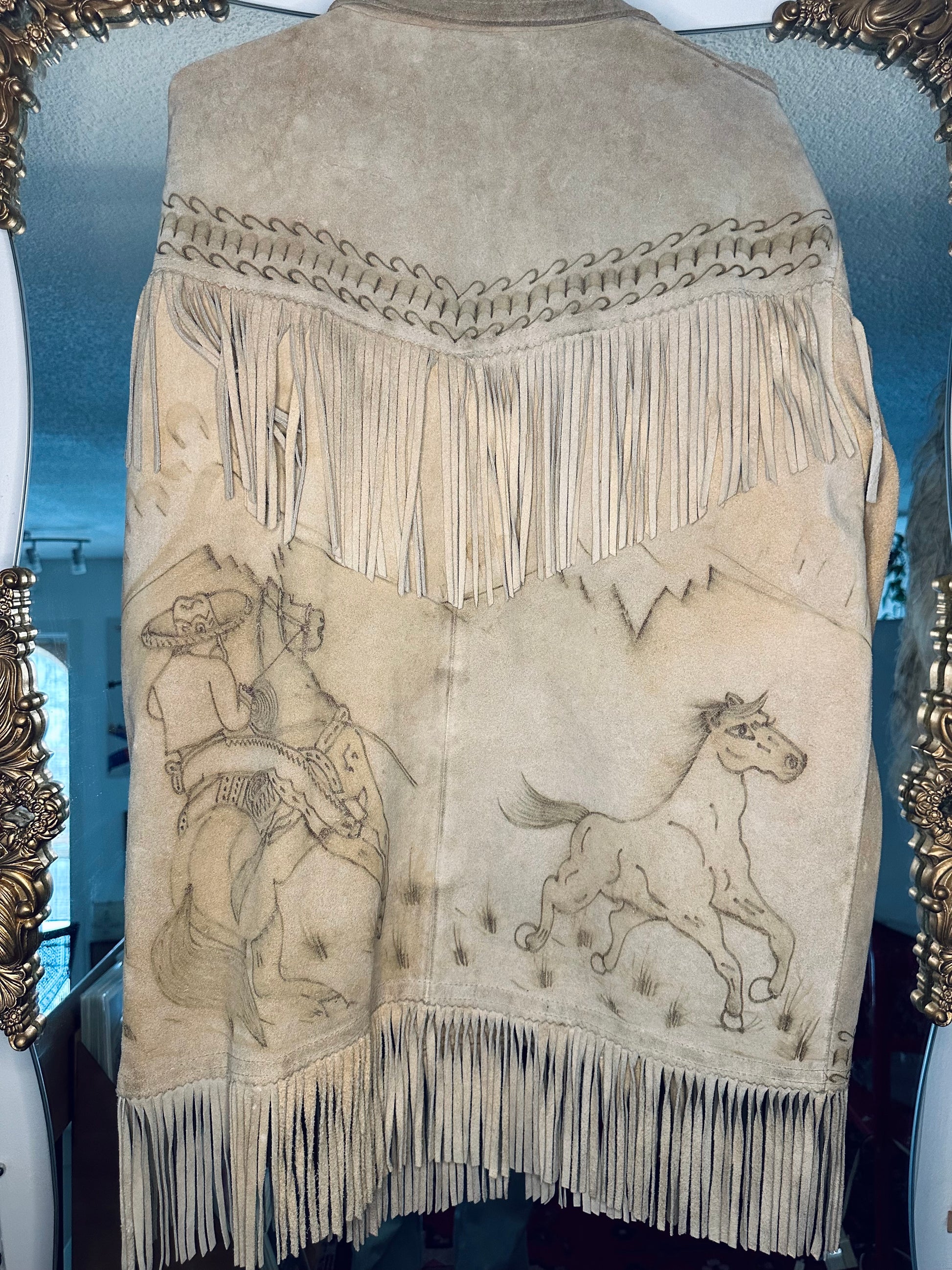 this jacket has horses & cowboys & blades of grass & all sorts of squiggles & patterns that seem to be etched into the fabric~ most likely by being burnt into it.