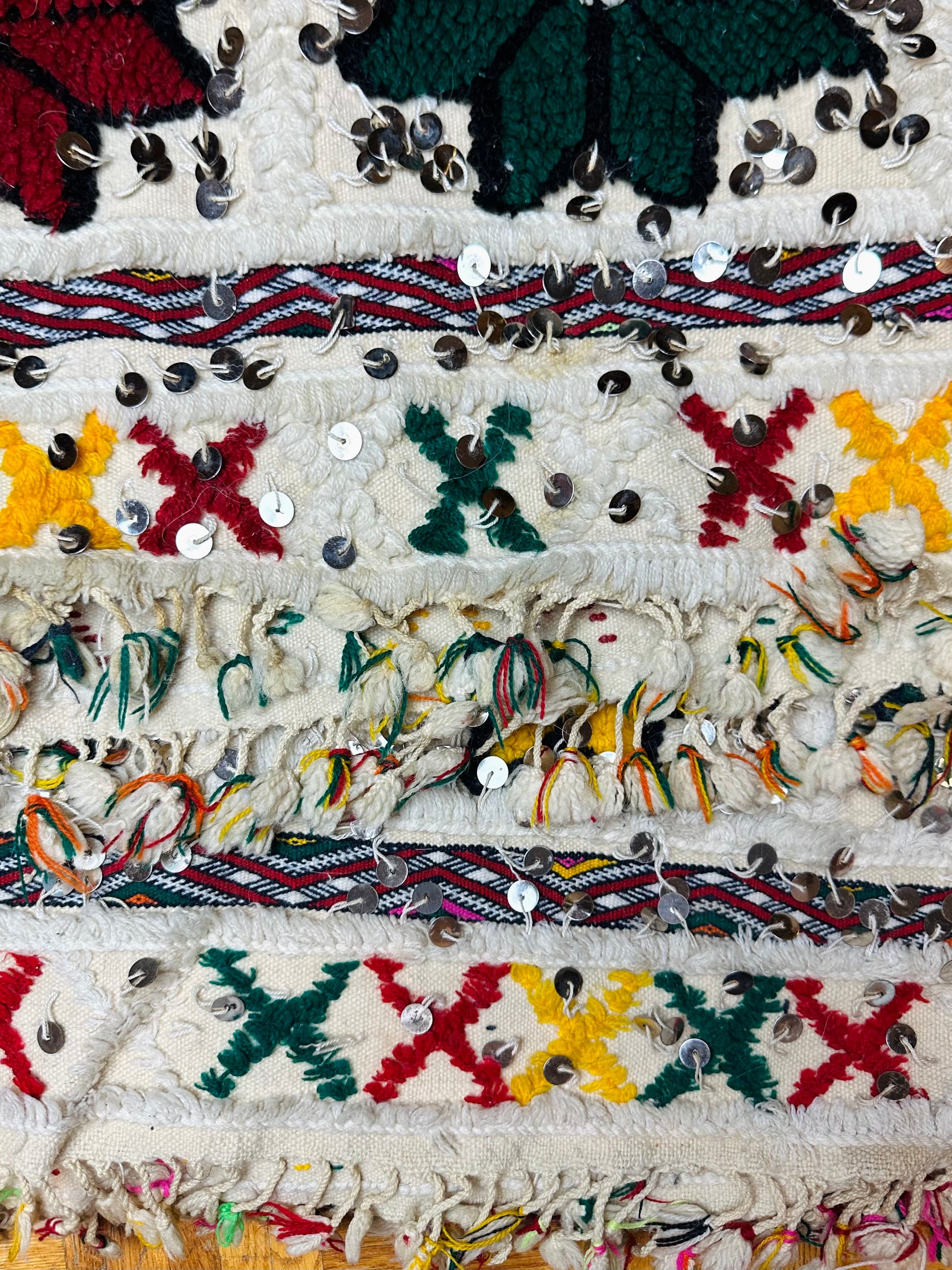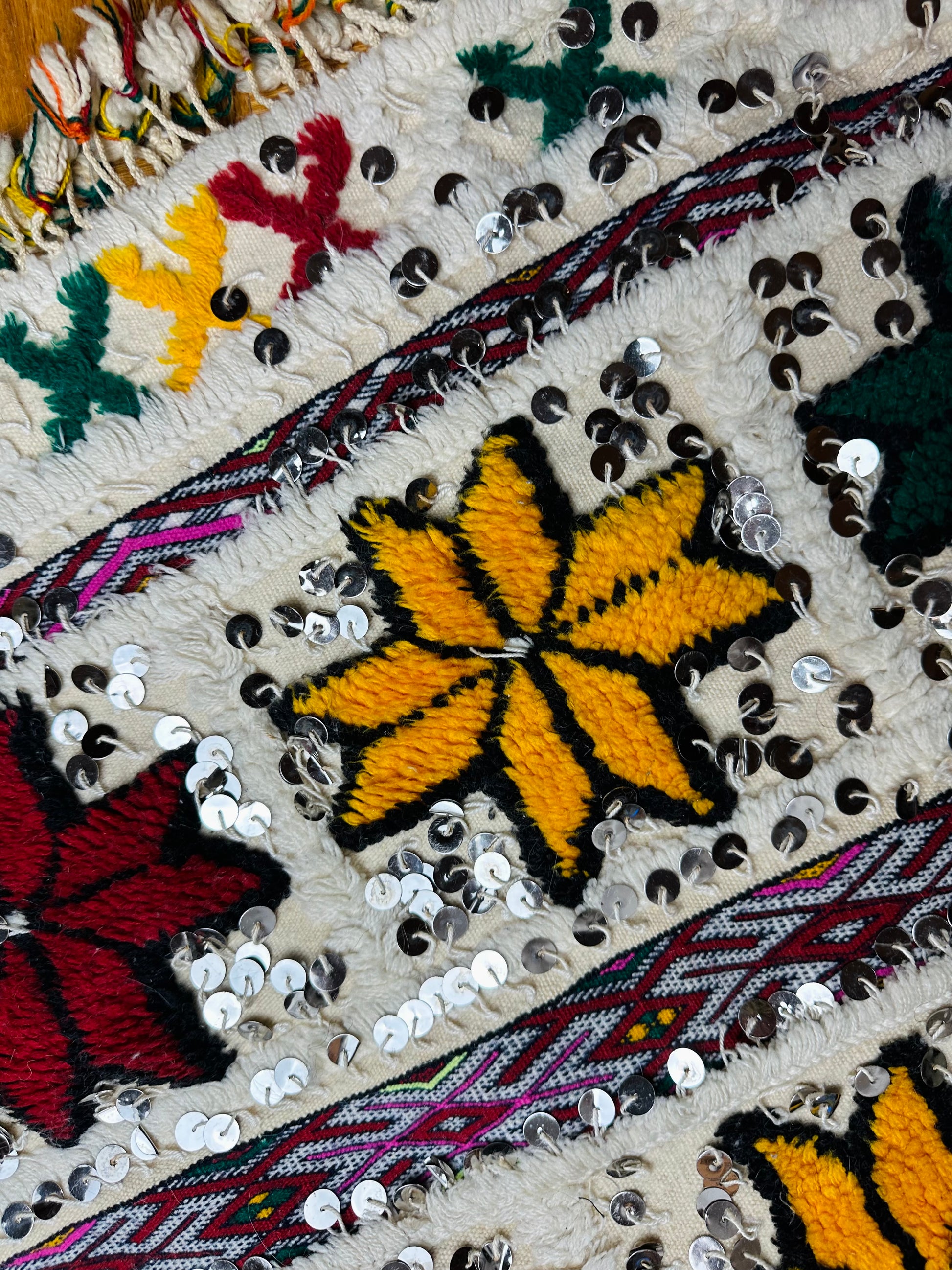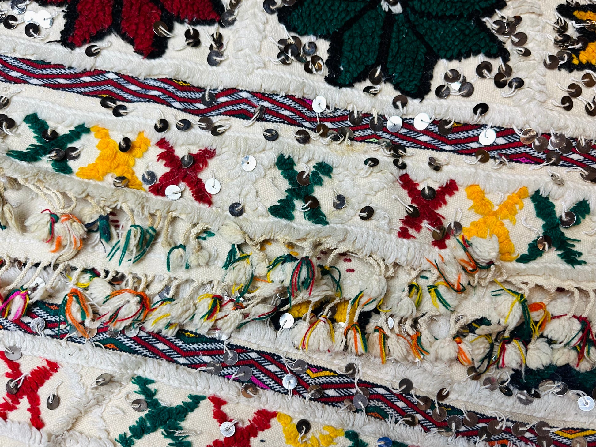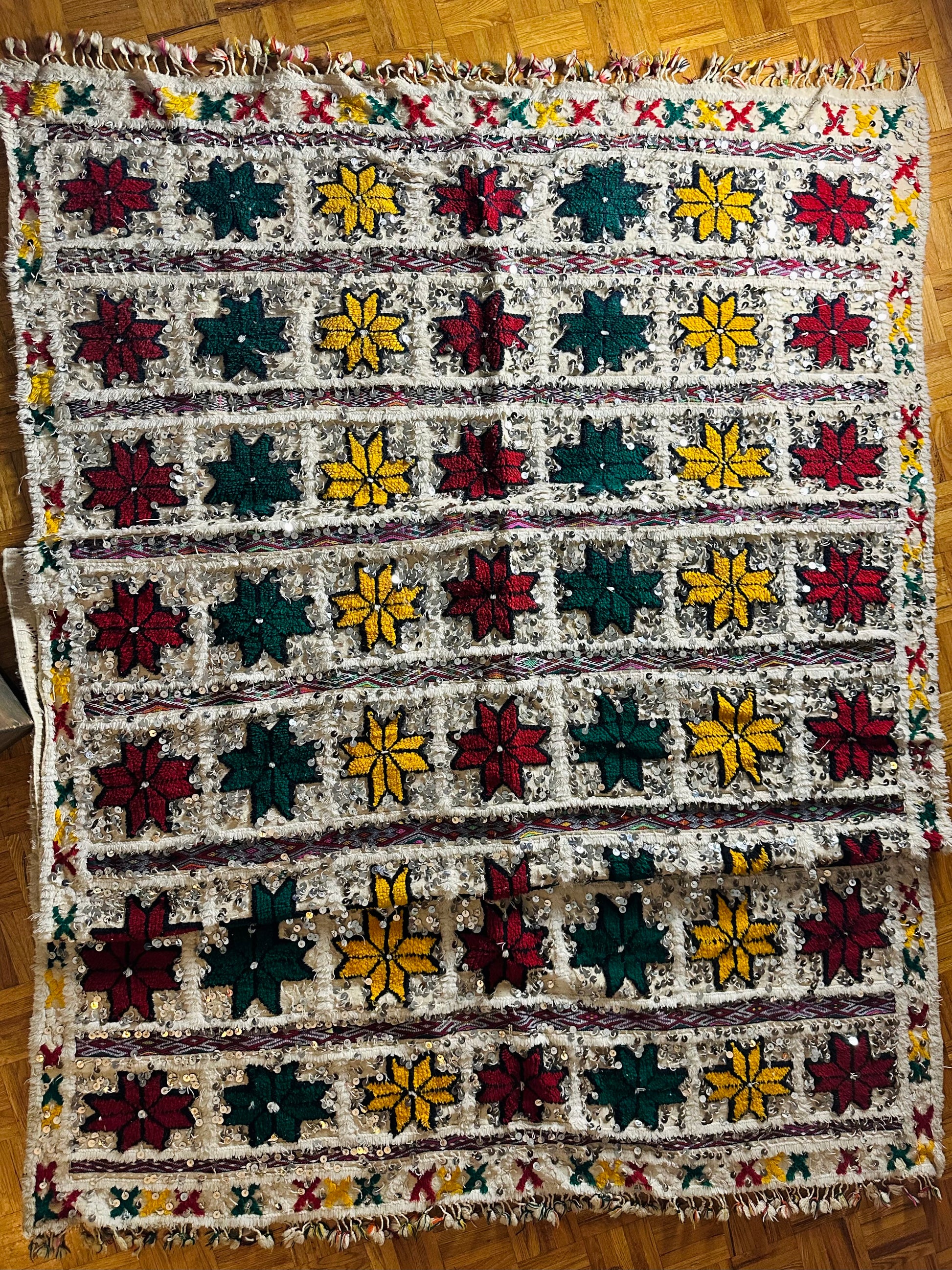 the un-dyed blanket is hand spun and thousands of sequins hand sown on the blanket. the handira stood for happiness, fertility & protection against evil.