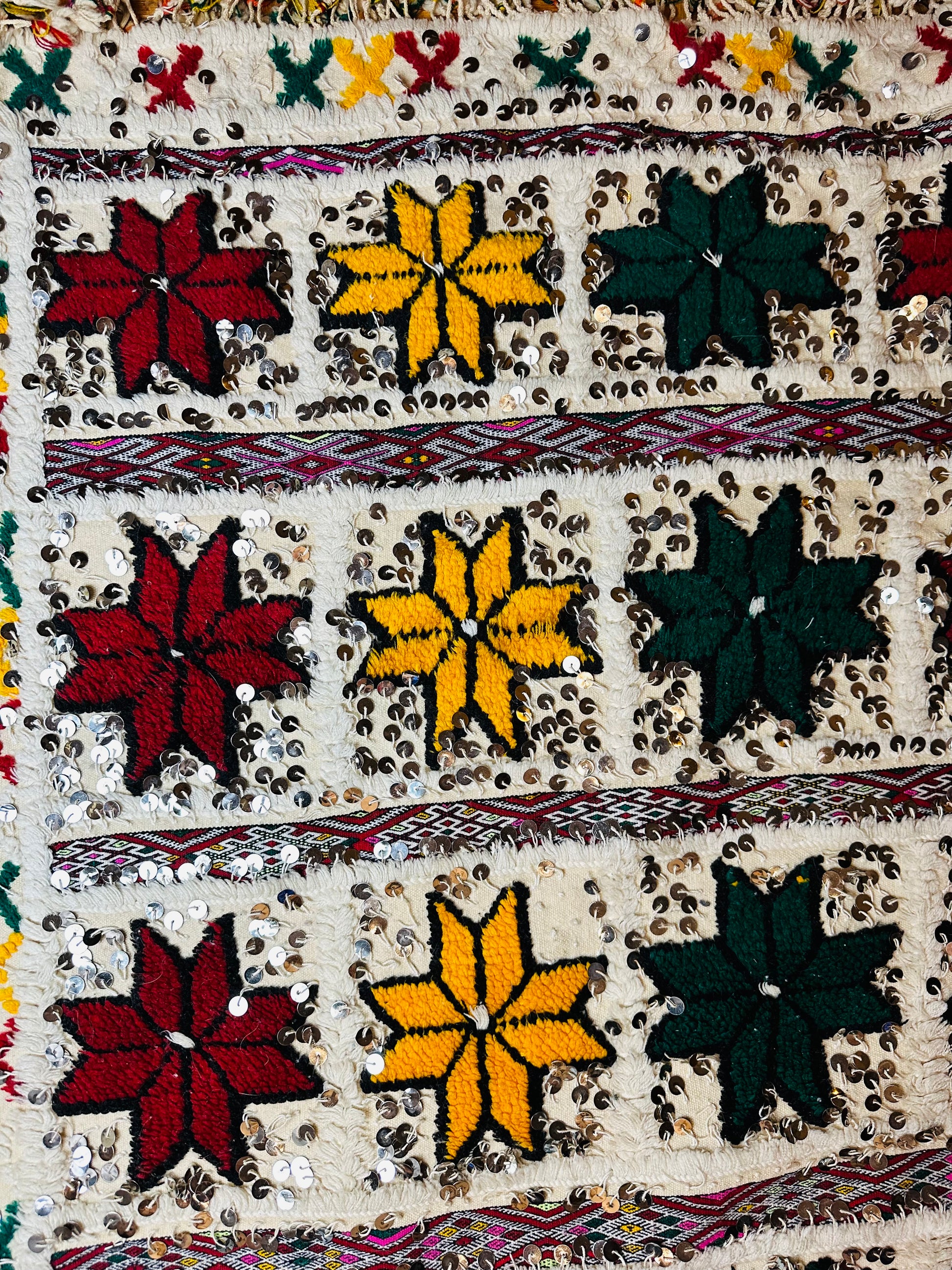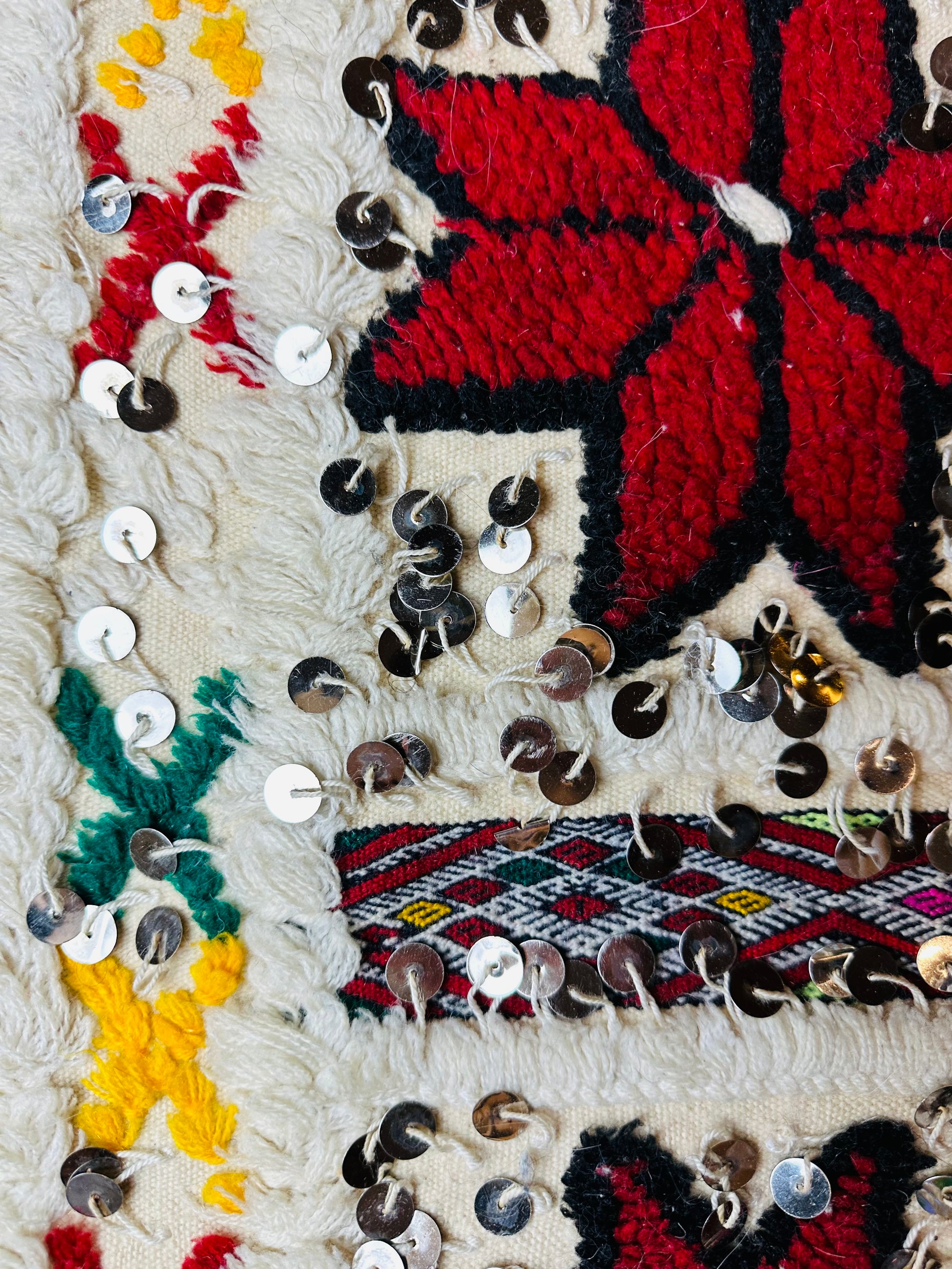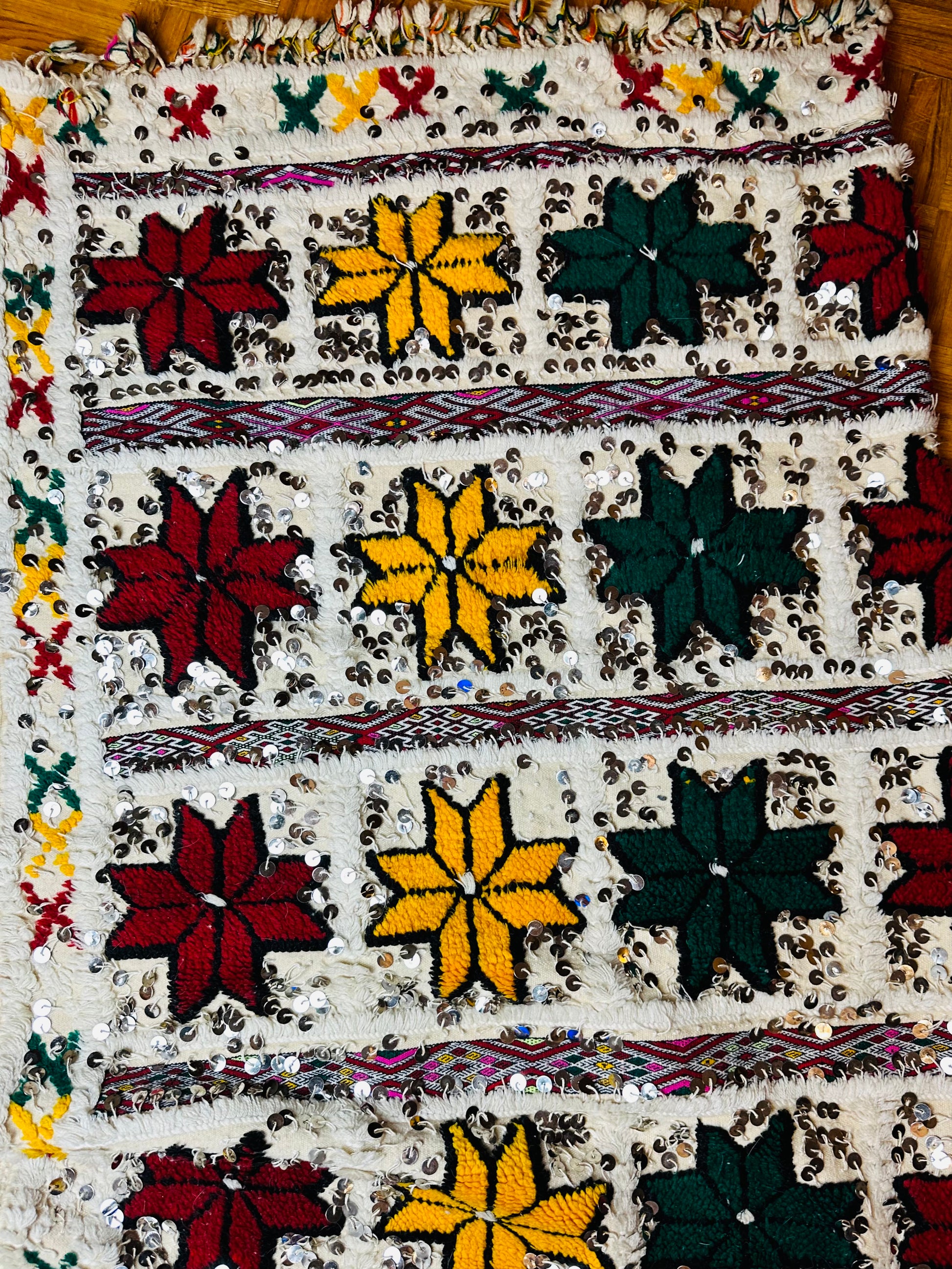 the un-dyed blanket is hand spun and thousands of sequins hand sown on the blanket. the handira stood for happiness, fertility & protection against evil.