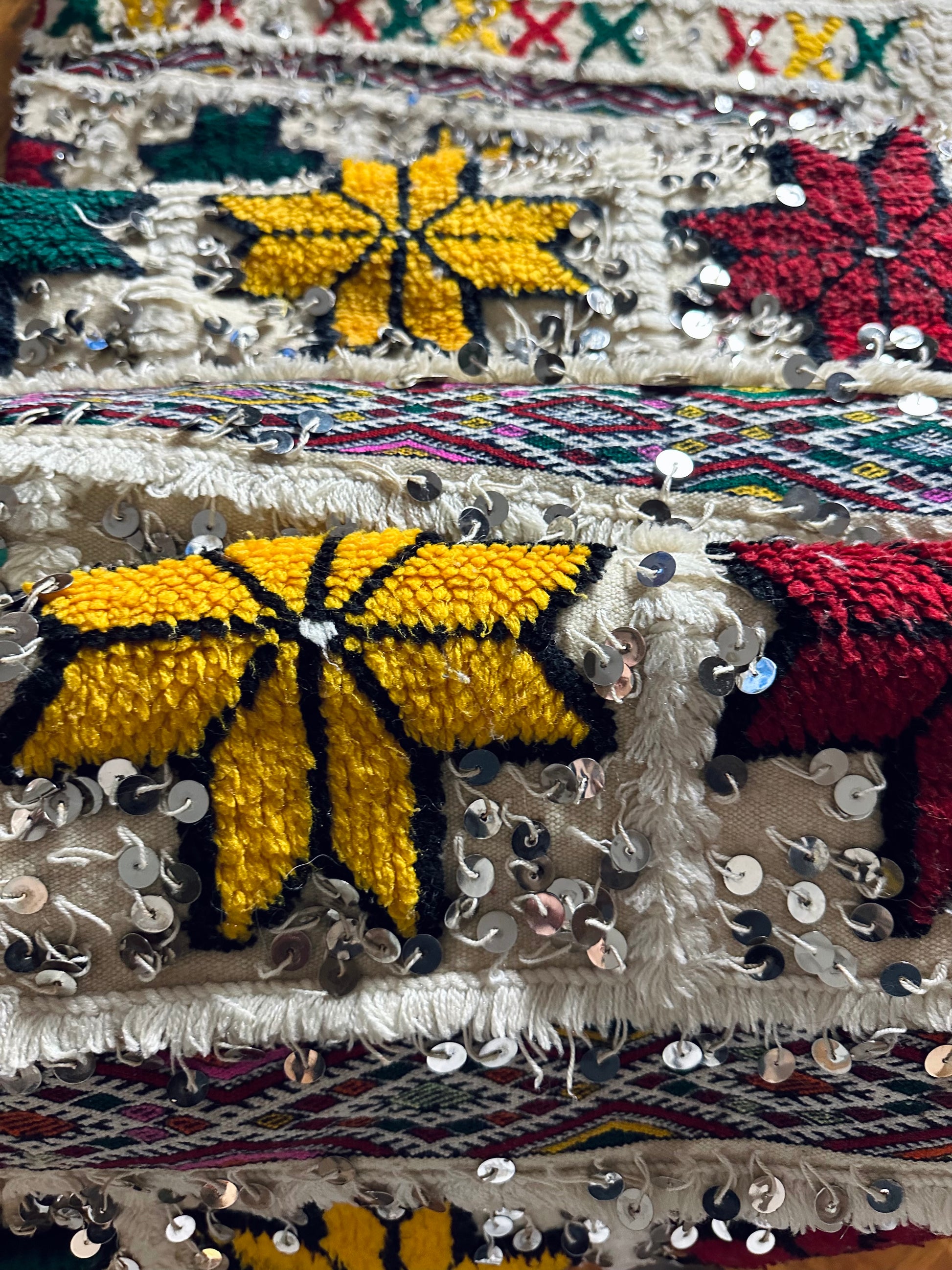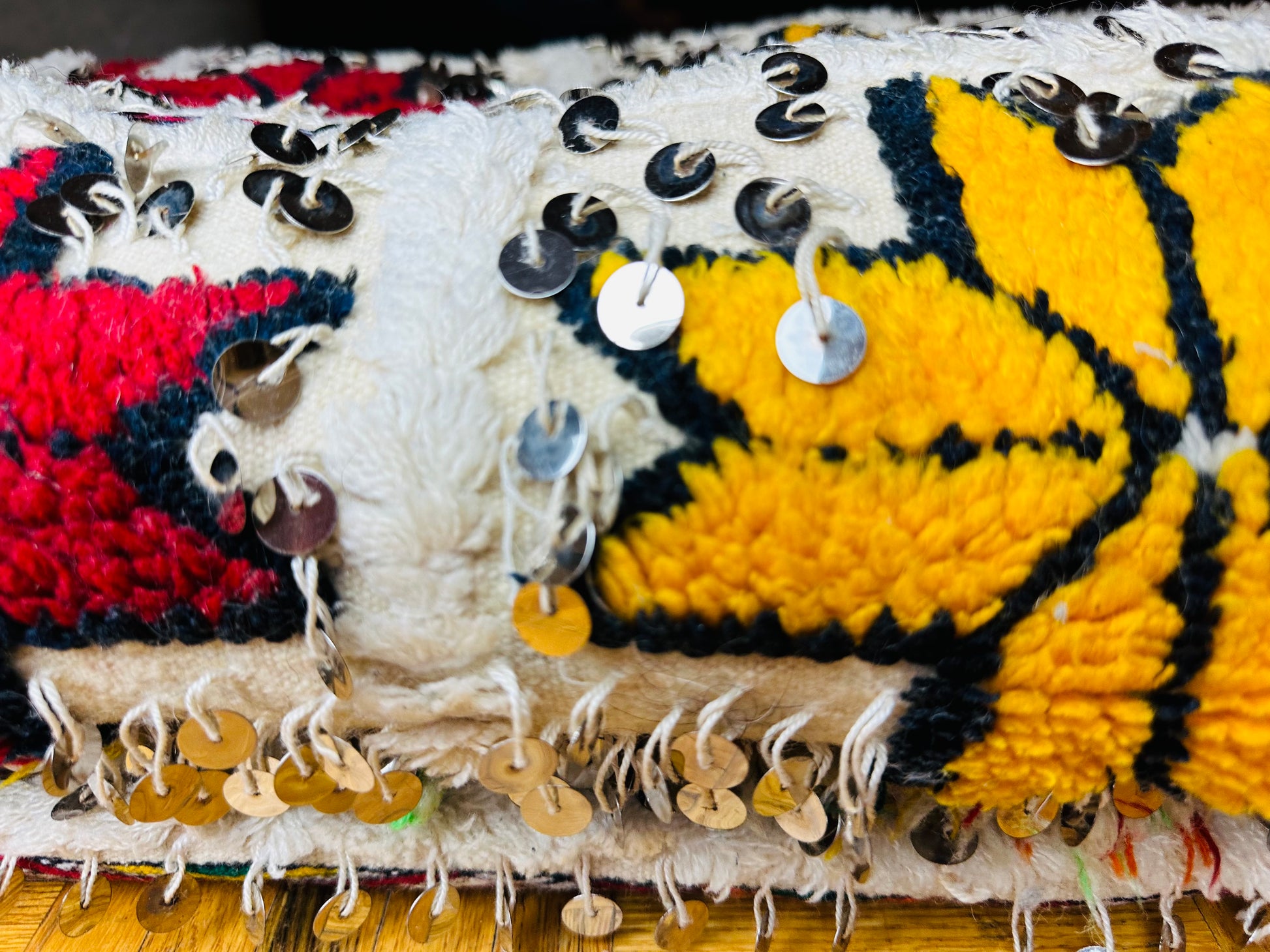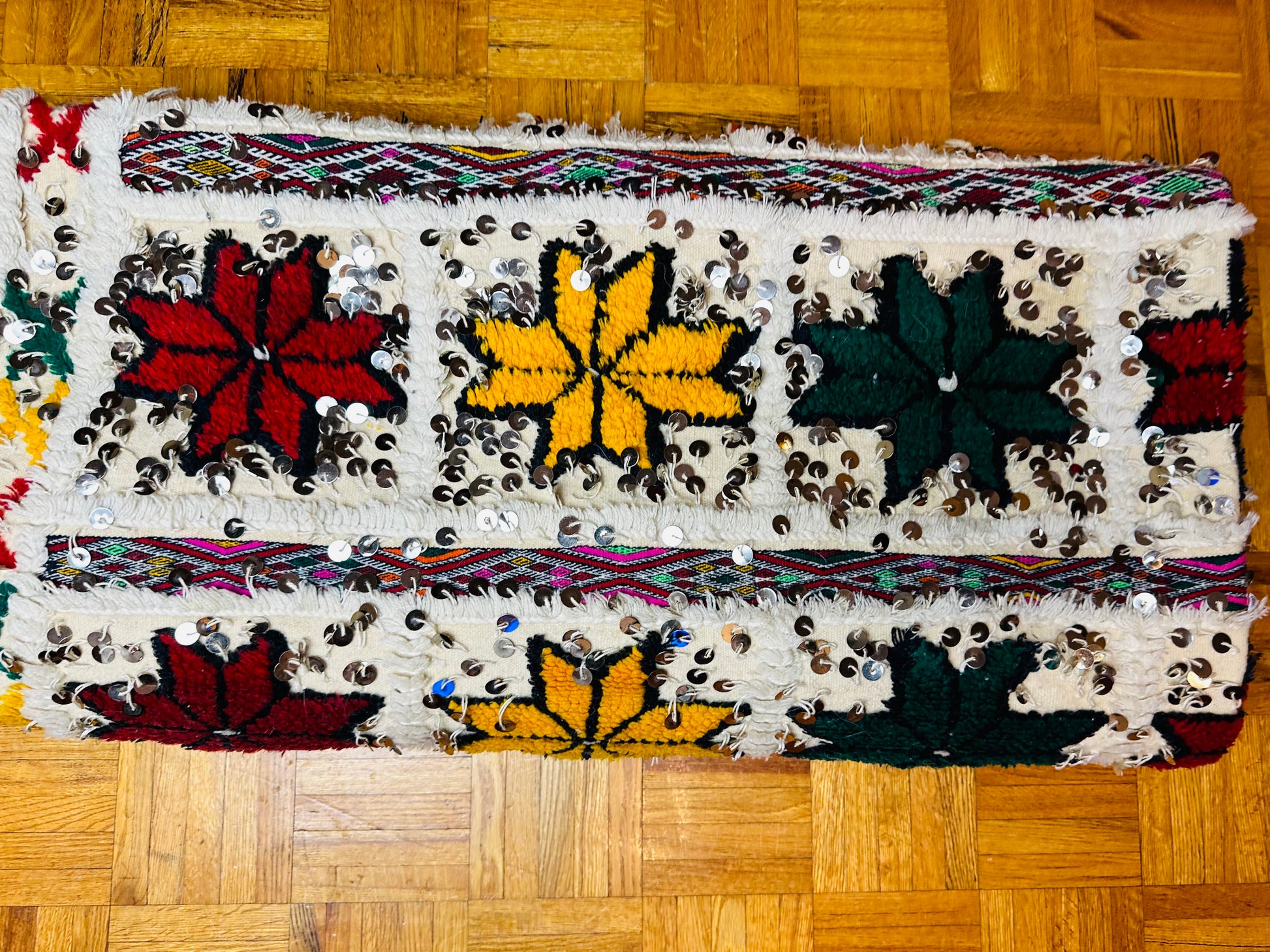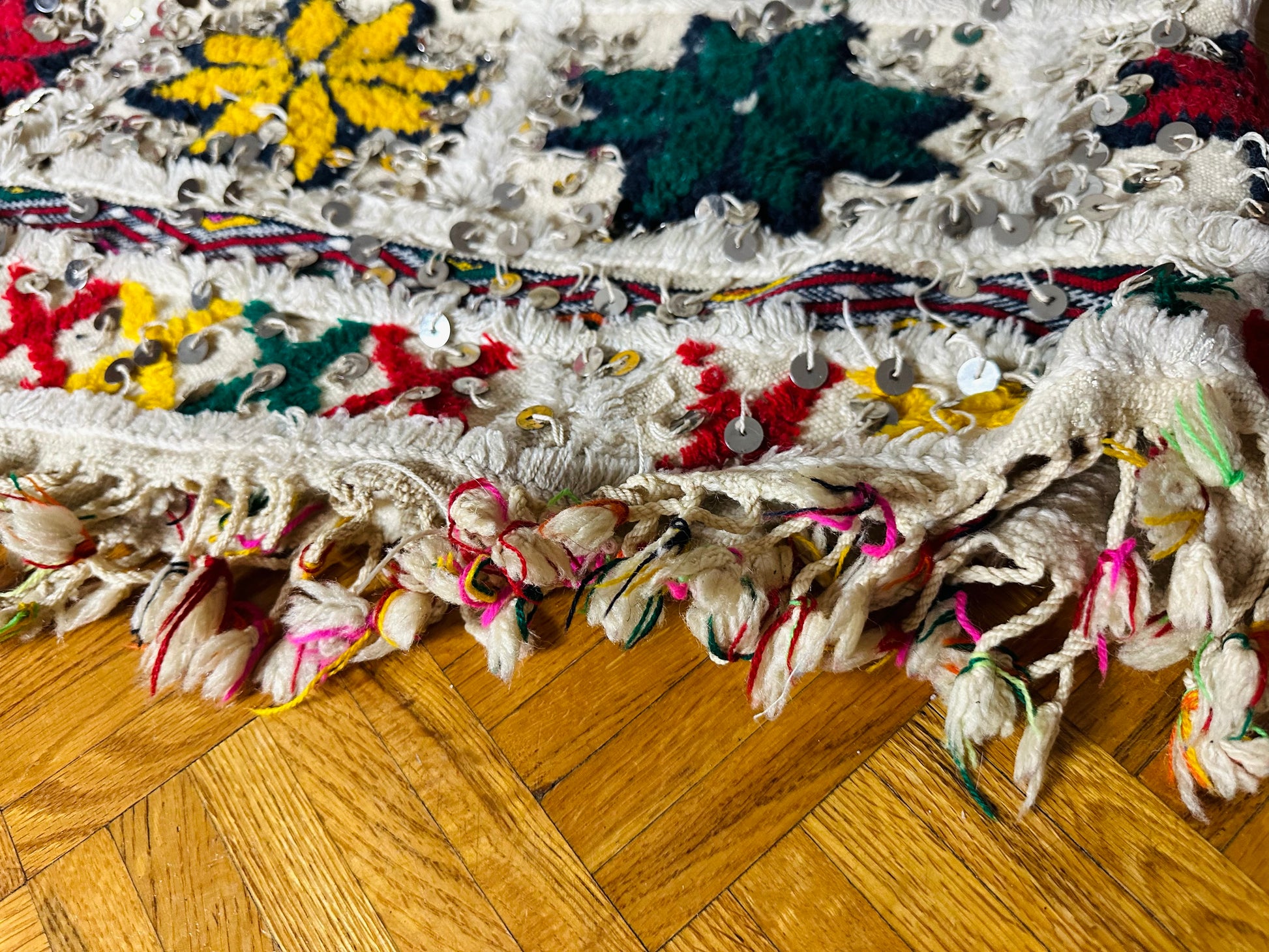 the un-dyed blanket is hand spun and thousands of sequins hand sown on the blanket. the handira stood for happiness, fertility & protection against evil.