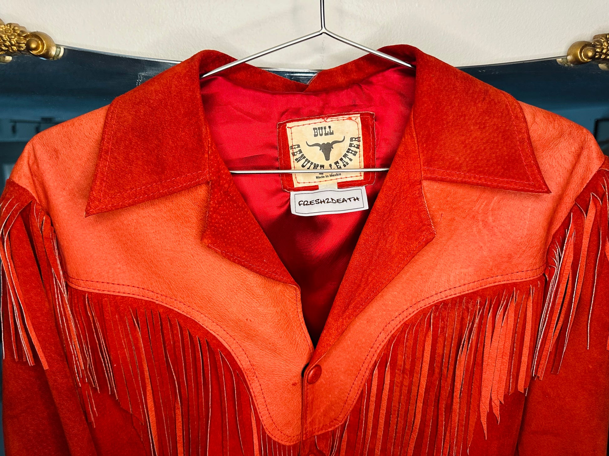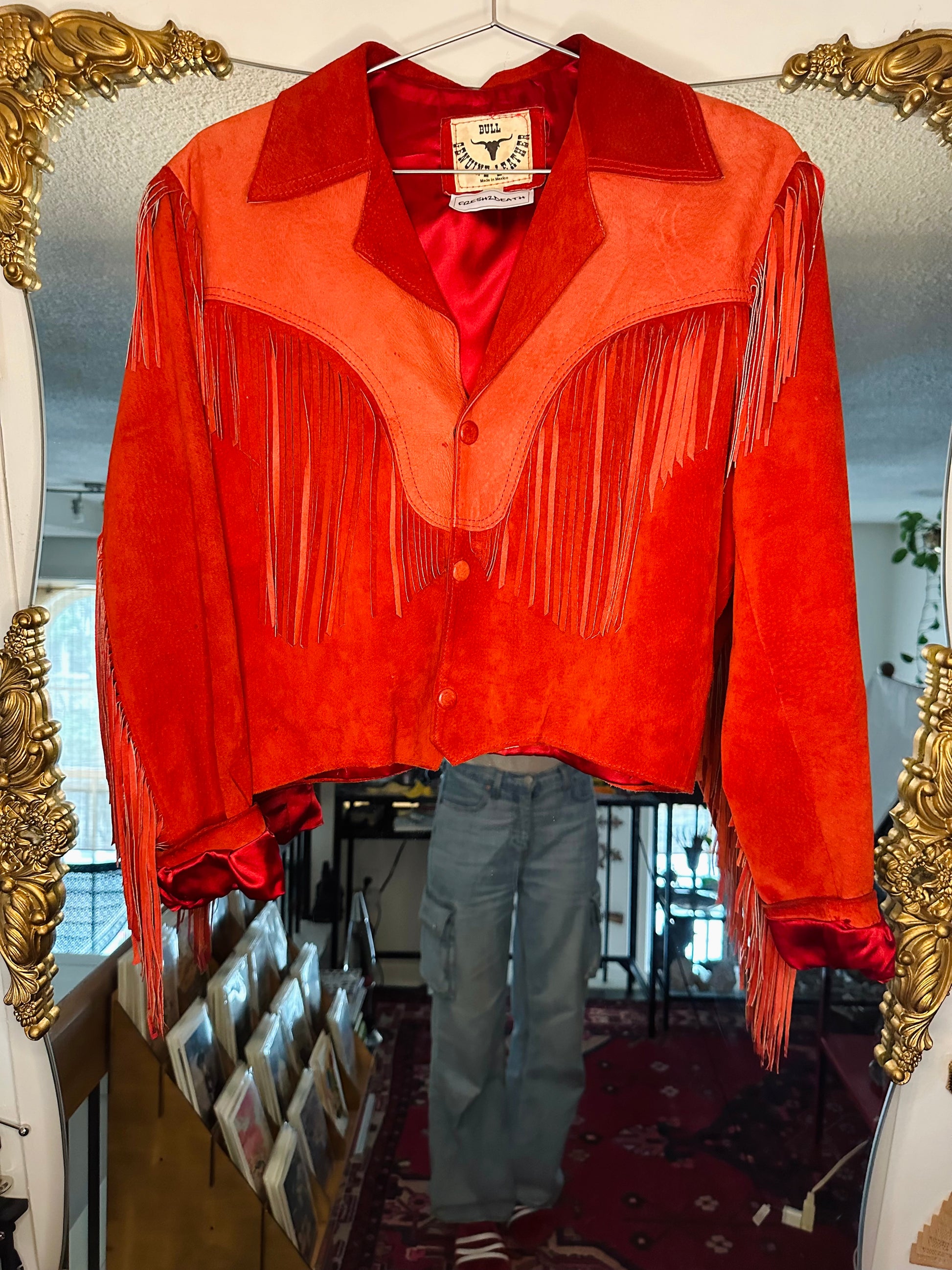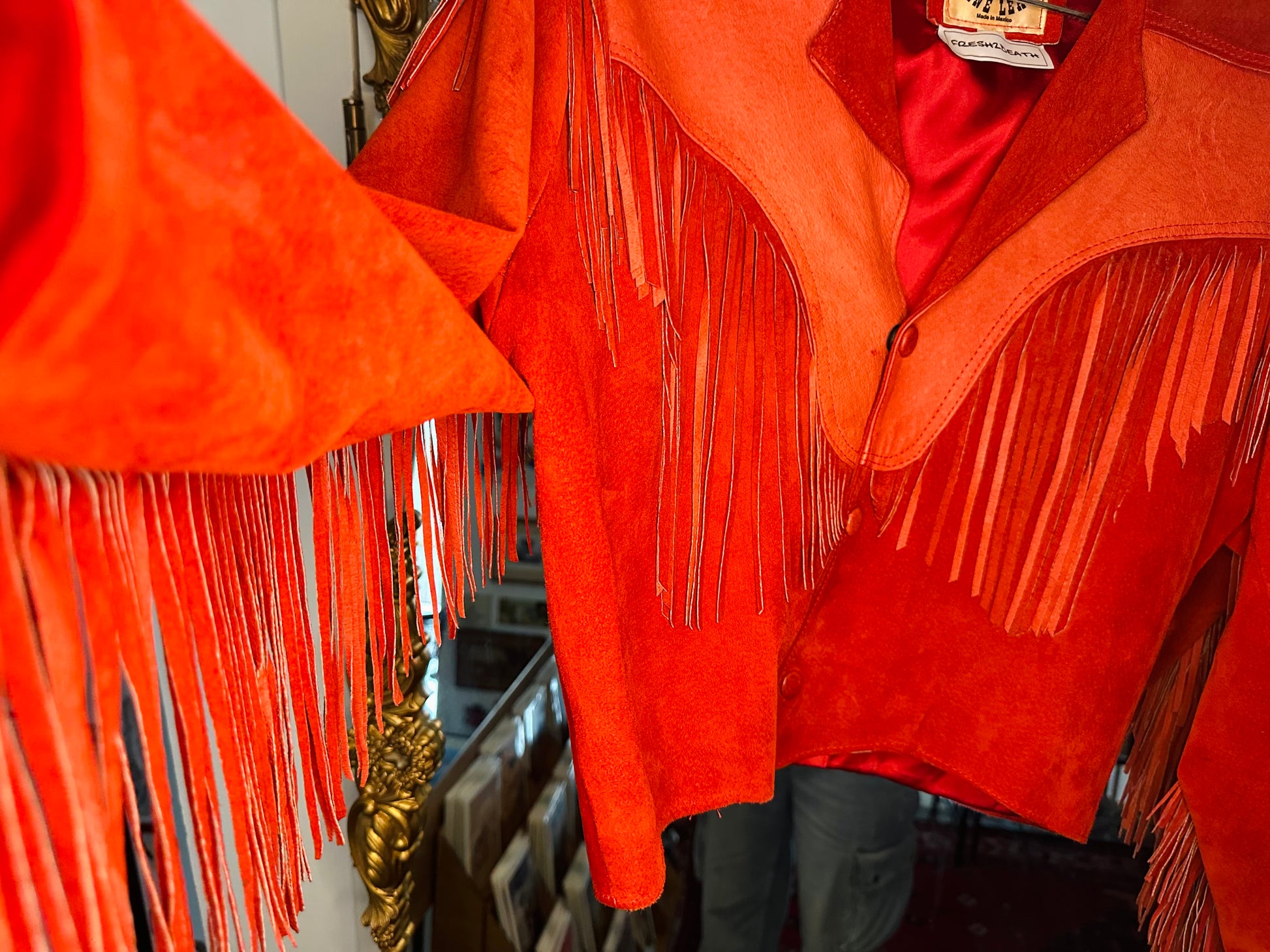 leather is then fully trimmed all along its edge with nubuck suede fringe. {there is some varying length on the fringe ~ part of its design}