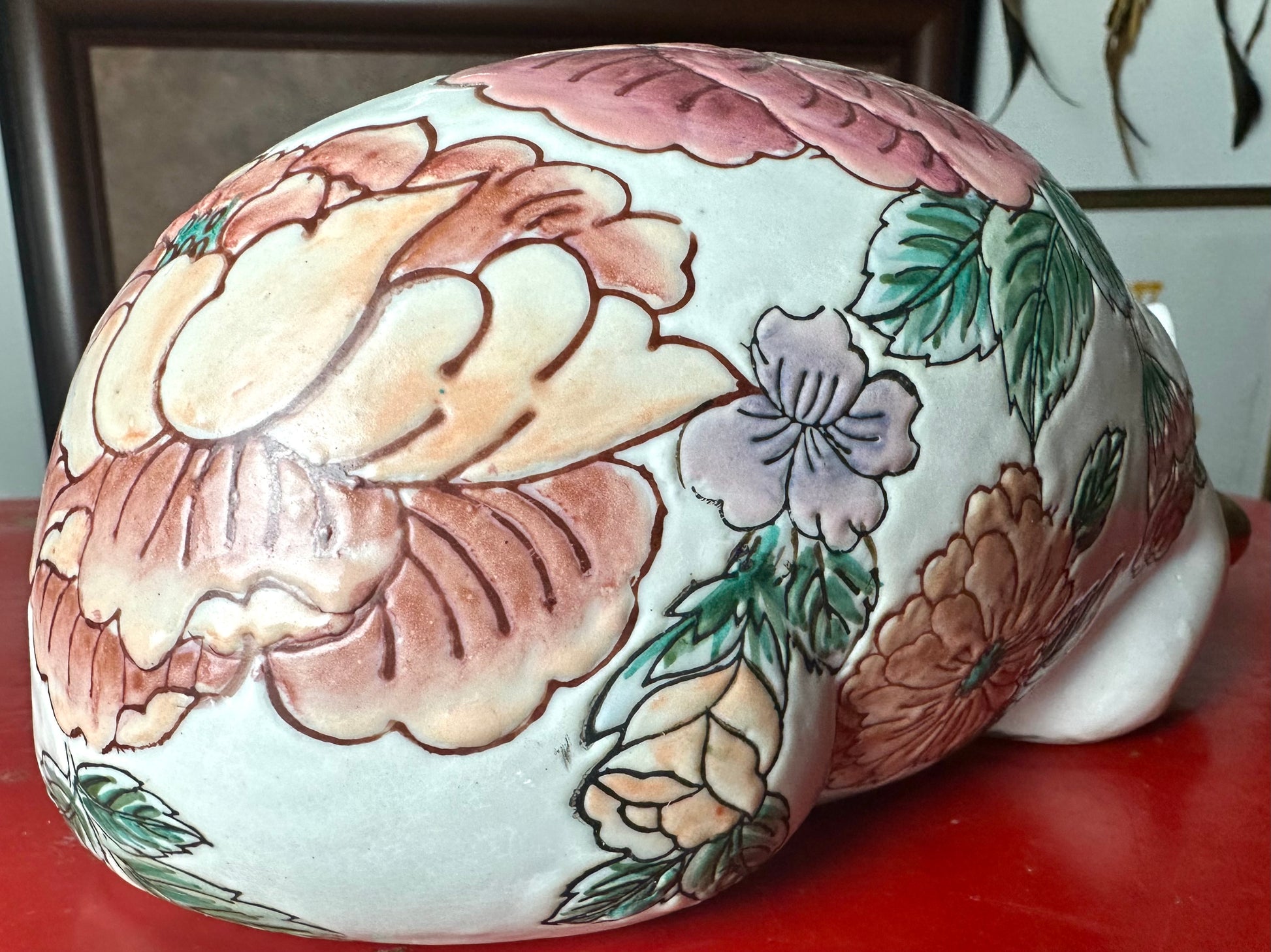 textured peonies, & dahlia type floras engraved & embossed. with various pink paints.