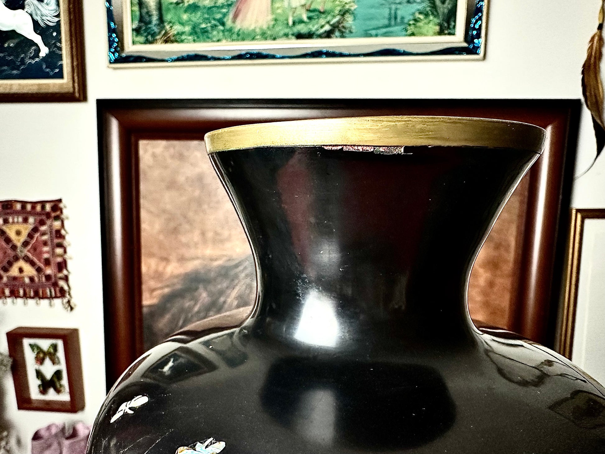 black lacquered vase with mother of pearl inlay of birds & flowers